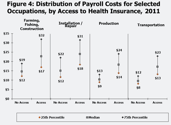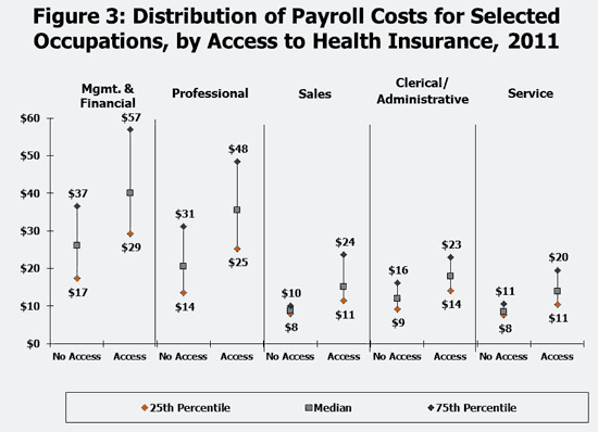 Because a wide variety of jobs can be captured even within a single occupation category, particularly for occupations like the sales, professional, and management categories, we assessed how payroll compensation is distributed within occupation categories. Figures 3 and 4 show the 25th percentile, median (or midpoint), and 75th percentile of payroll for workers with and without access to health benefits within each of the nine occupation categories in 2011. 4 For example, looking at workers with access to health benefits in the service occupation, 25 percent had payroll compensation at or below $11, one half had payroll compensation equal to or less than $14, and 75 percent had payroll compensation at or below $20. In contrast, for service workers without access to health benefits at work, a quarter had hourly payroll compensation at or below $8, one half had hourly payroll compensation at or below $9 and only one quarter had hourly payroll compensation above $11. This is a lower and narrower range than is seen for service workers with access to health benefits. Large shares of workers without access to health benefits have relatively low payroll compensation when compared to workers within the same occupations with access to health benefits. In fact, for several of these occupations, the payroll compensation at the 25th percentile for those with access was near the 75th percentile for those without access.