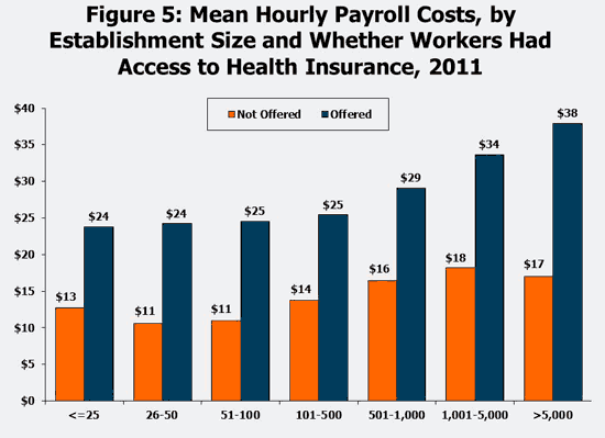 Employees with relatively high wages are more likely to have access to employer-provided health benefits. Employees in establishments with access to health benefits, on average, receive more than twice as much in payroll and non-health benefit compensation as employees who do not have access to health benefits at work (Figure 1). When employer costs for health benefits are added to compensation for workers who have access (i.e., total compensation), the difference between these groups grows. In 2011, employees with access to health benefits had total compensation averaging $35.50 per hour, compared with $14.28 for employees without access. The gap has been widening. From 1999 to 2011, the real percentage change in total compensation for workers with access was about 10.3 percent compared to 1.7 percent for those without access.3