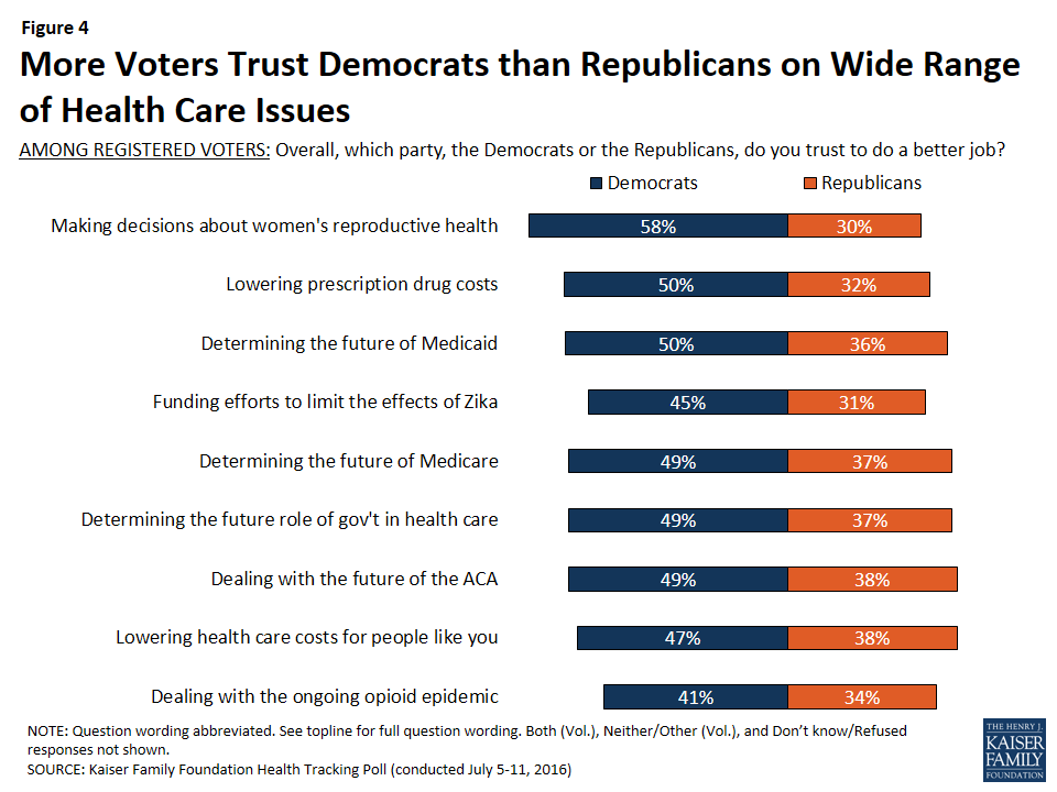 - Overall, the survey finds more voters say the Democratic Party (47 percent) than the Republican Party (35 percent) best represents their health care views. When asked which of the major party’s presumptive presidential nominees best represents their health care views, more voters choose Hillary Clinton (46 percent) than Donald Trump (32 percent).