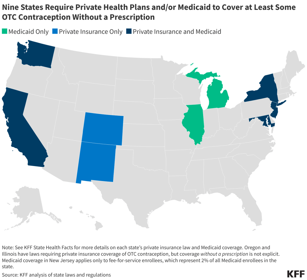 3) Seven states require state-regulated private health insurance plans to cover at least some methods of over-the-counter contraception without a prescription free of cost-sharing, and seven states use state funds to offer the same coverage for Medicaid enrollees.