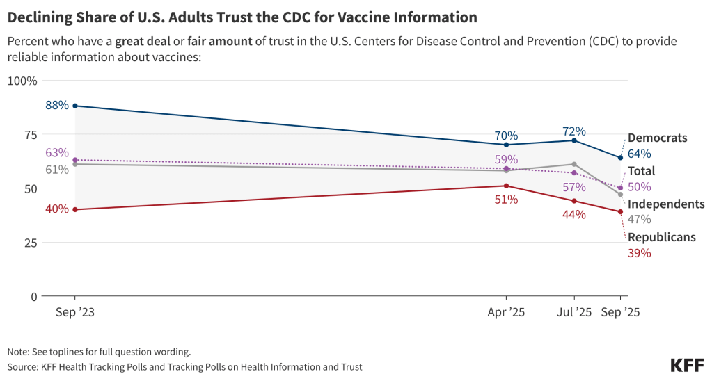 Among partisans, Democrats remain the most likely to say they trust the CDC on vaccines (64%), though that is down 24 percentage points since 2023. Among independents, nearly half (47%) say they trust the CDC on vaccines, down from 61% in 2023, while the share of Republicans who trust the CDC’s vaccine information is lower (39%) but similar to where it stood in 2023 (40%).