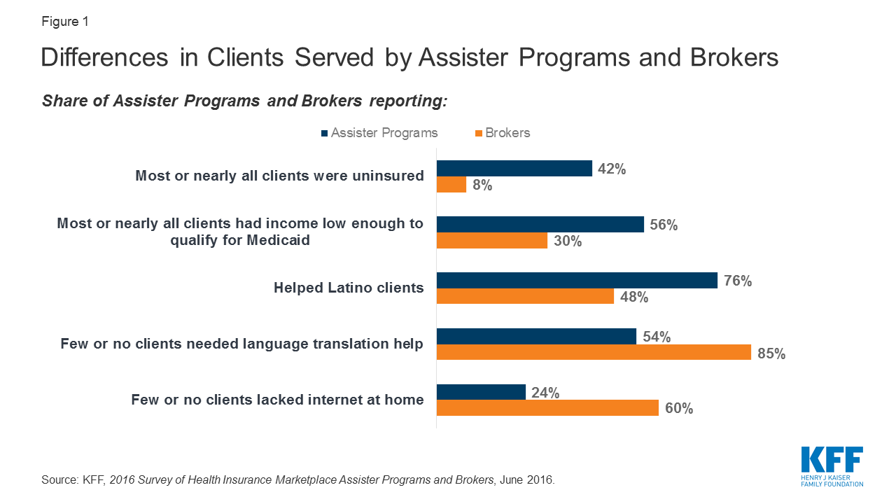 CMS continues to promote the role played by insurance brokers and agents in assisting consumers. KFF surveys of marketplace assisters and brokers have found that while the work of brokers overlapped to a significant extent with that of Navigators and other marketplace assister programs, these professionals were not interchangeable. Brokers were significantly less likely than Navigators to help individuals who were uninsured, had limited English proficiency, or who lacked internet at home (Figure 1). Brokers were also far less likely to help complete applications for Medicaid or CHIP for low-income consumers who learn through the “no wrong door” marketplace application process that they are not eligible for premium tax credits but may be eligible for public plan coverage.