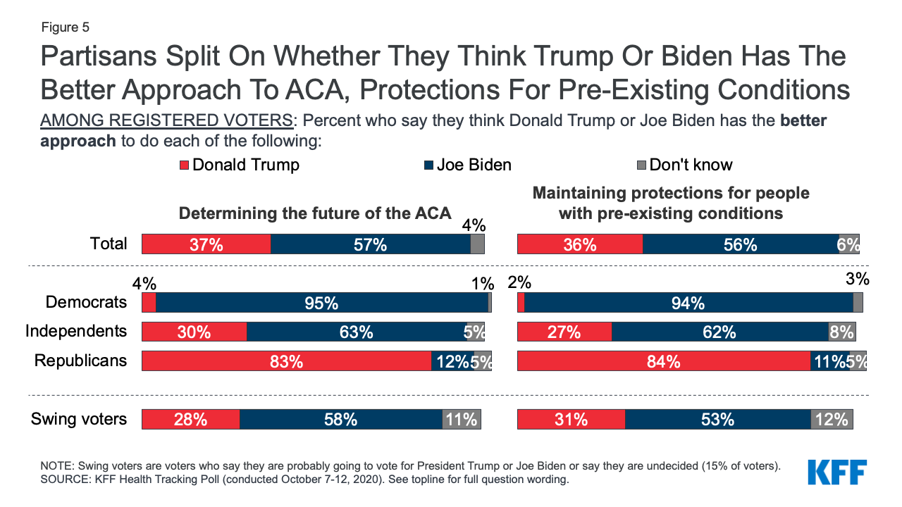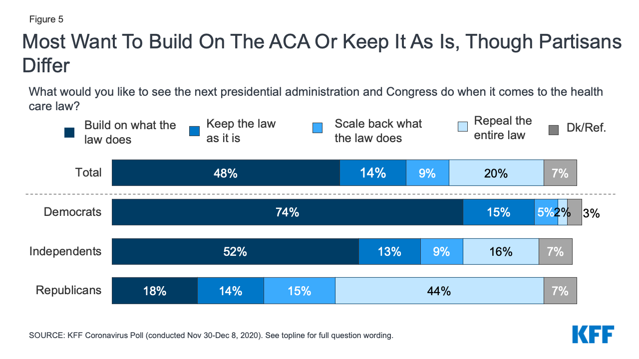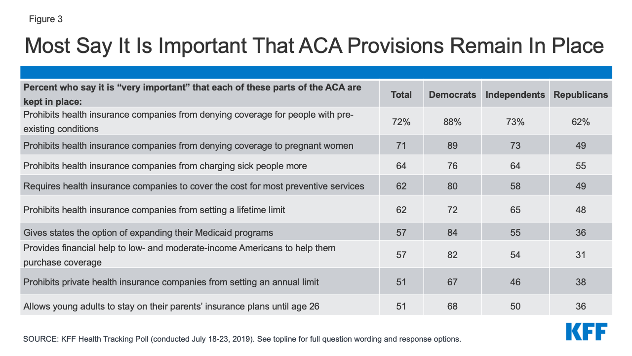 Over the past decade, the ACA has been the subject of both legal challenges as well as Congressional actions aimed at overturning the 2010 health care law. While the law is not overwhelmingly popular among the public, no replacement plan has garnered significant support from the public. This may be due to the fact that many of the specific provisions included in the law are popular and the public would like for them to remain – even if the entire ACA is overturned. For example, the 2020 Texas v. California case challenged the legality of the individual mandate and brought special attention to the law’s protections for people with pre-existing medical conditions. These provisions prohibit insurance companies from denying coverage based on a person’s medical history (known as guaranteed issue) and prohibit insurance companies from charging those with pre-existing conditions more for coverage (known as community rating). The July 2019 KFF Health Tracking Poll found that a majority of the public says it is very important for many of the ACA provisions to be kept in place, including the guaranteed issue provision (72%) and community rating (64%). While partisans are divided over the importance of keeping many provisions of the ACA in place, majorities of Democrats, Republicans, and independents say it is “very important” to continue each of these protections for people with pre-existing conditions. In addition, few Republicans, Democrats, and independents said they wanted the Supreme Court to overturn these protections.