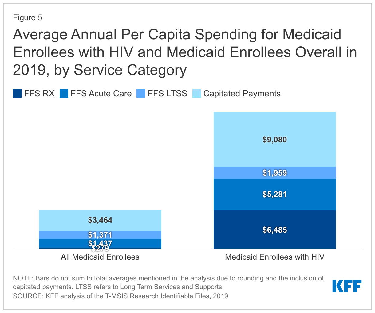 - Medicaid accounted for 45% of all federal HIV spending in FY221 and it is the largest source of public spending for HIV care in the U.S. In FY22, the federal government spent an estimated $13 billion on Medicaid services for people with HIV. Additionally, state Medicaid spending totaled an estimated $5.4 billion in FY22.2 Spending has increased over time, reflecting the growing numbers of enrollees with HIV and the rising cost of care and treatment.