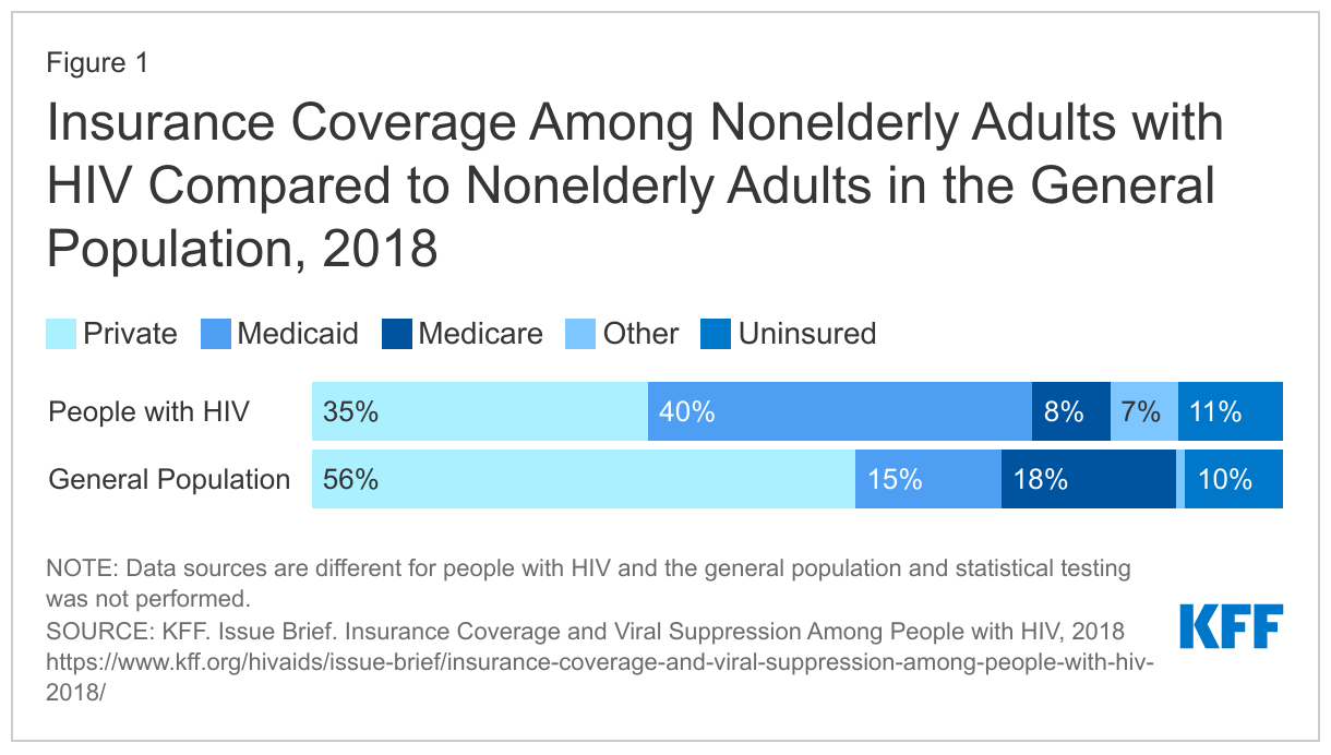 - Medicaid is the largest source of insurance coverage for people with HIV in the United States, covering an estimated 40% of the nonelderly adults with HIV, compared to just 15% of the nonelderly adult population overall.