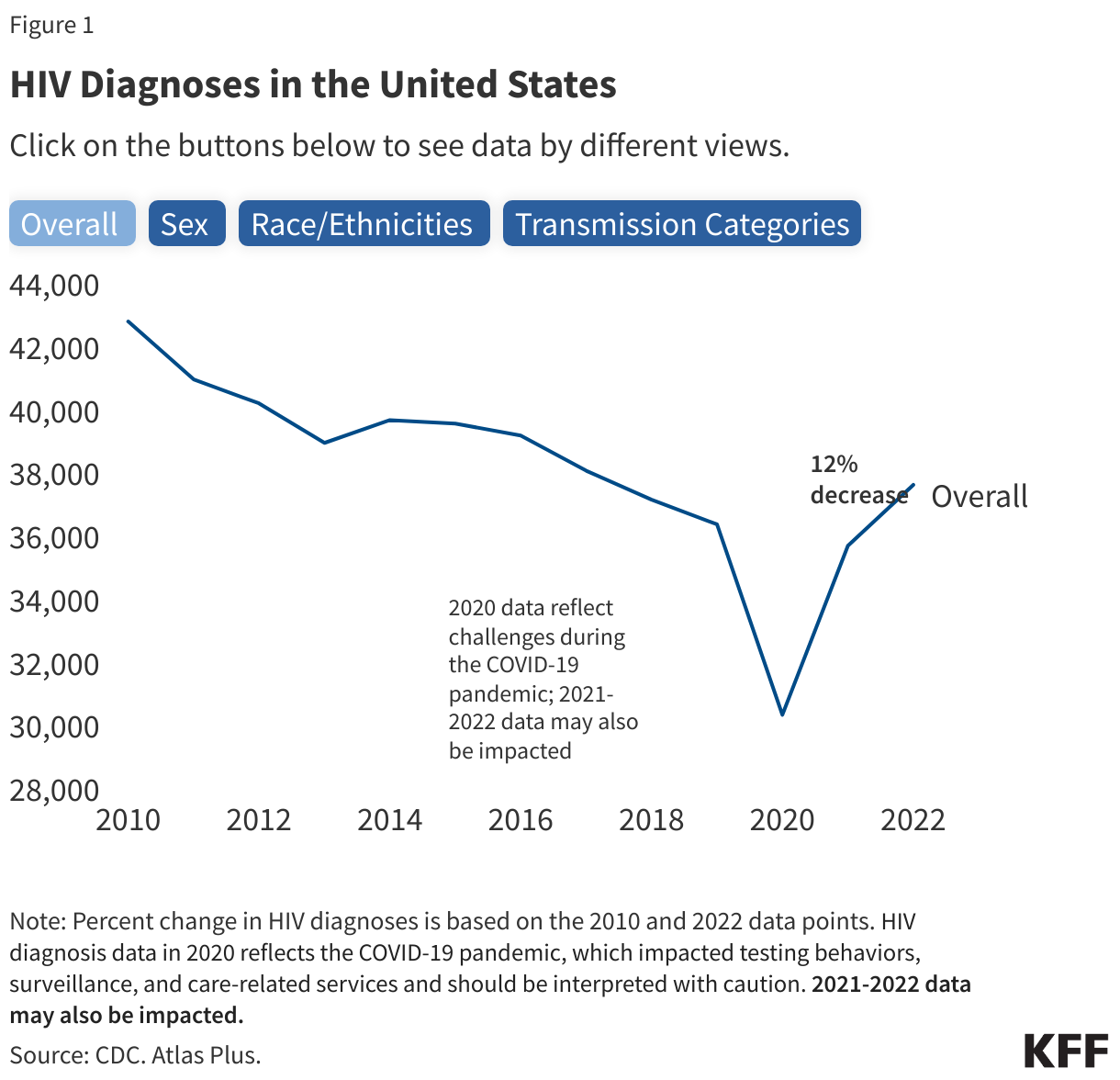 - Looking at recent trends, from 2010 to 2022, only Hispanic/Latino and Asian people experienced an increase in HIV diagnoses (24% and 26% increases, respectively), while all other groups of people by race/ethnicity, sexes, and transmission categories saw decreases in HIV diagnoses. (See Figure 1.)