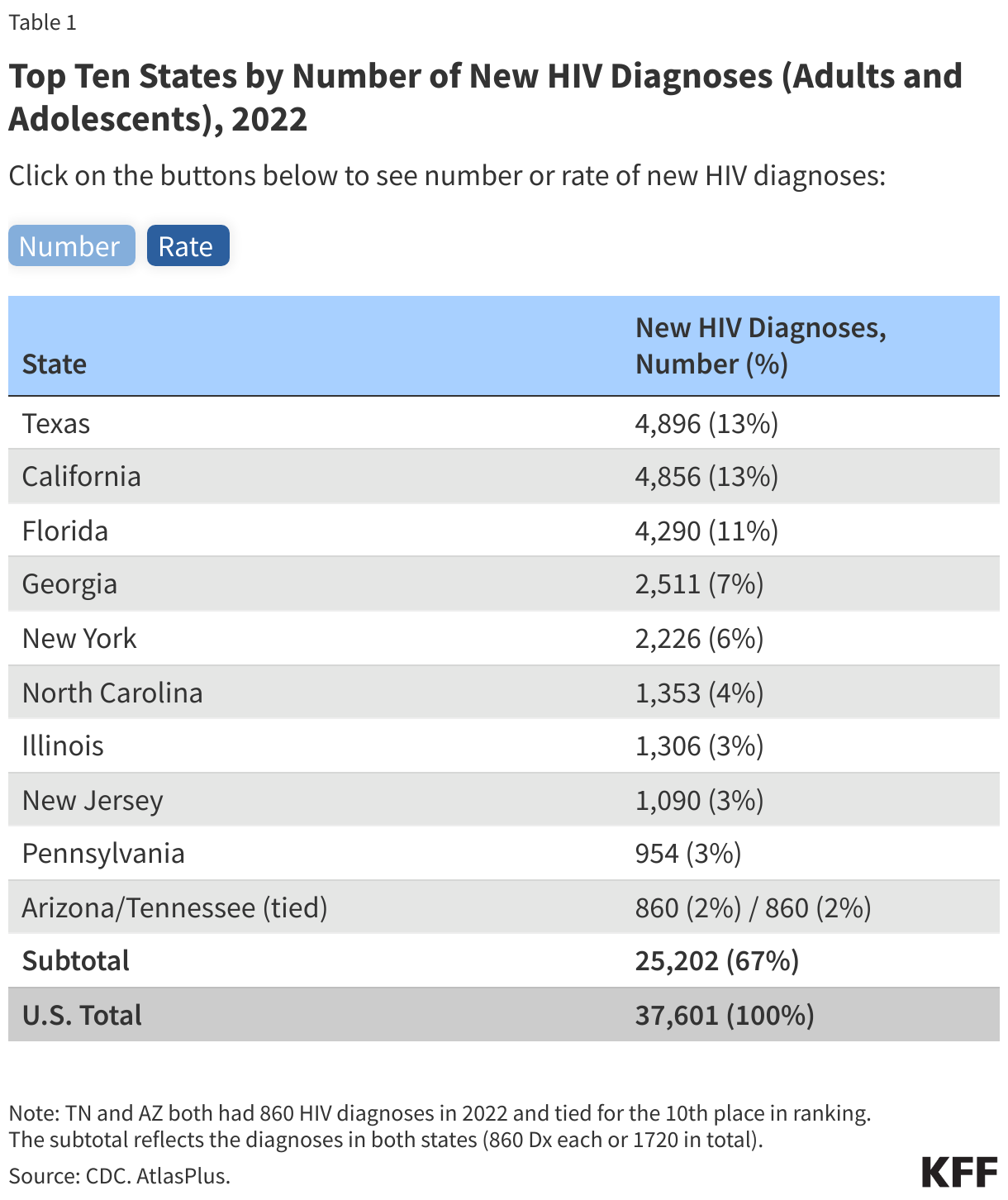 - Although HIV has been reported in all 50 states, the District of Columbia, and U.S. territories, the impact of the epidemic is not uniformly distributed. The top ten states in terms of number of HIV diagnoses are home to 55% of the U.S. population and accounted for about two-thirds (67%) of diagnoses among adults and adolescents in 2022 (Table 1). Regionally, the South saw a disproportionate burden and accounted for over half of HIV diagnoses in 2022.
