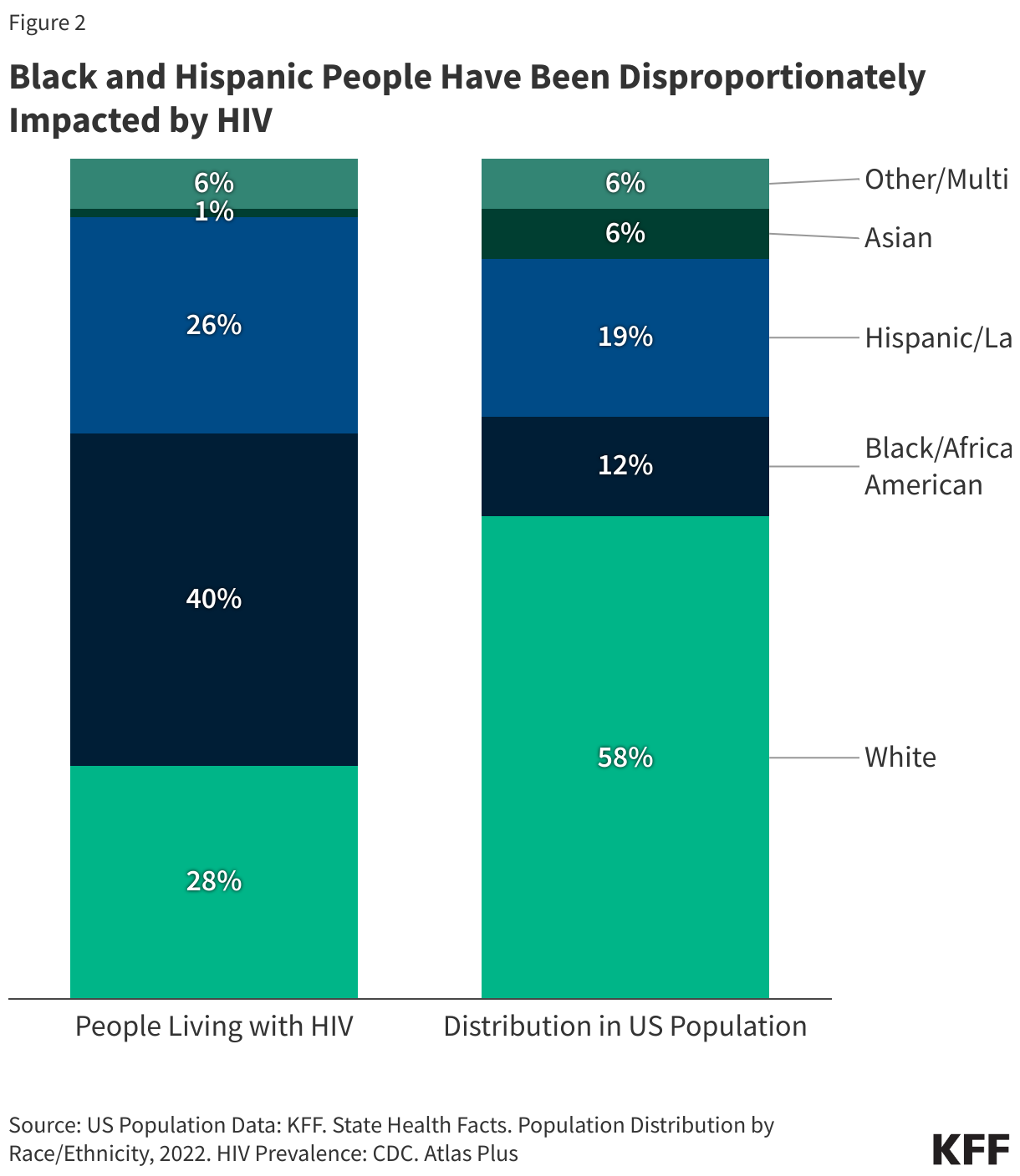 - Black and Latino people account for a disproportionate share of new HIV diagnoses, relative to their size in the U.S. population. Black people account for more people living with HIV than any other racial or ethnic group – in 2022, an estimated 40% of people living with HIV in the U.S. are Black despite Black people accounting for just 12% of the U.S. population. About a quarter of people living with HIV are Hispanic/Latino (26%) but Hispanic/Latino people make up 19% of the U.S. population (see Figure 2).