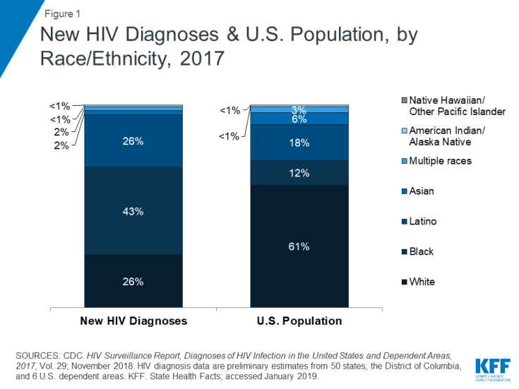 - Blacks and Latinos account for a disproportionate share of new HIV diagnoses, relative to their size in the U.S. population (see Figure 1).39,40Blacks also account for more people living with HIV than any other racial group – an estimated 468,800 of the more than 1.1 million people living with HIV in the U.S. are black.41