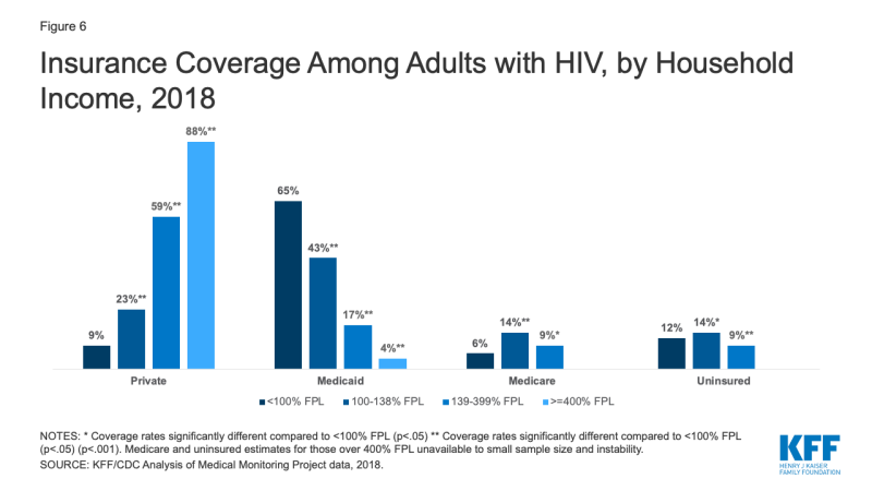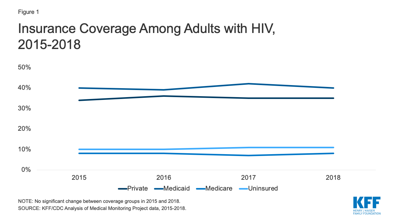 - While the overall rate of uninsurance is now similar for people with HIV and the population overall, there are substantial differences in the type of coverage. Medicaid plays a much more significant role for people with HIV compared to the general population (40% v. 15%), and it is their single largest source of coverage, and people with HIV are much less likely to be covered by private insurance (35% v. 56%).