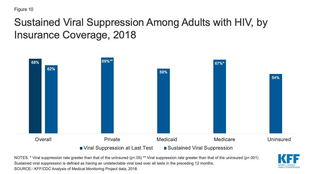 - Finally, we find that sustained viral suppression rates varied by payer, and were higher among those with private insurance or Medicare, compared to the uninsured. Viral suppression among those with Medicaid was not significantly different from the uninsured, a finding that could reflect the equalizing role of the Ryan White Program for the uninsured and lower incomes among individuals in these coverage groups. Additionally, those with Ryan White support were significantly more likely to have sustained viral suppression compared those without, regardless of payer.