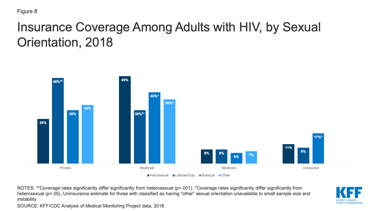 Sexual Orientation. Overall, 47% of adults with HIV identify as heterosexual and 41% as lesbian or gay. Smaller shares identify as bisexual (9%) or as “something else” (3%). Heterosexual adults with HIV, who are disproportionally Black and Latina women, were less likely than lesbian and gay adults with HIV to have private insurance coverage (25% v. 48%) and more likely to have Medicaid (49% v. 30%). Bisexual adults with HIV were less likely to have Medicaid (40% v. 49%) and more likely to be uninsured than heterosexuals (17% v. 11%). (Fig. 8)