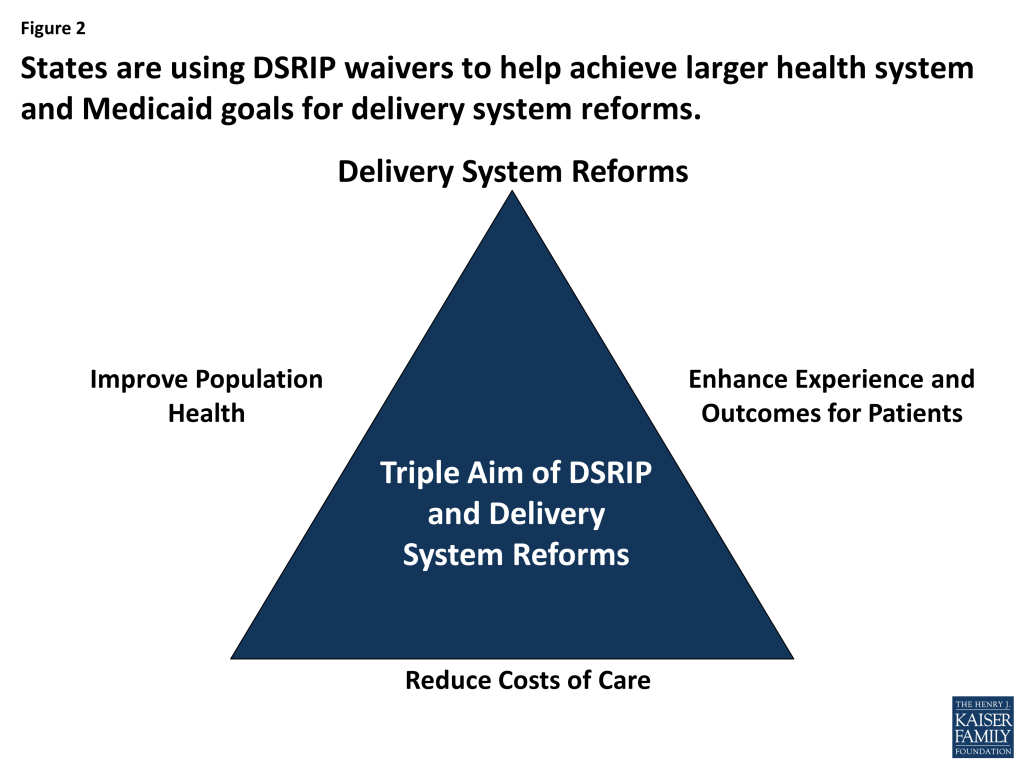 “Delivery System Reform Incentive Payment” or DSRIP programs are another piece of the dynamic and evolving Medicaid delivery system reform landscape. DSRIP initiatives are part of broader Section 1115 Waiver programs and provide states with significant funding that can be used to support hospitals and other providers in changing how they provide care to Medicaid beneficiaries. Originally, DSRIP initiatives were more narrowly focused on funding for safety net hospitals and often grew out of negotiations between states and HHS over the appropriate way to finance hospital care. Now, however, they increasingly are being used to promote a far more sweeping set of payment and delivery system reforms. The first DSRIP initiatives were approved and implemented in California and Texas in 2010 and 2011, followed by New Jersey, Kansas and Massachusetts in 2012 and 2013 and most recently New York which was approved in 2014 and will be implemented in 2015. At the highest level, DSRIP waivers are designed to advance the “Triple Aim” of improving the health of the population, enhancing the experience and outcomes of the patient and reducing the per capita cost of care (Figure 2).