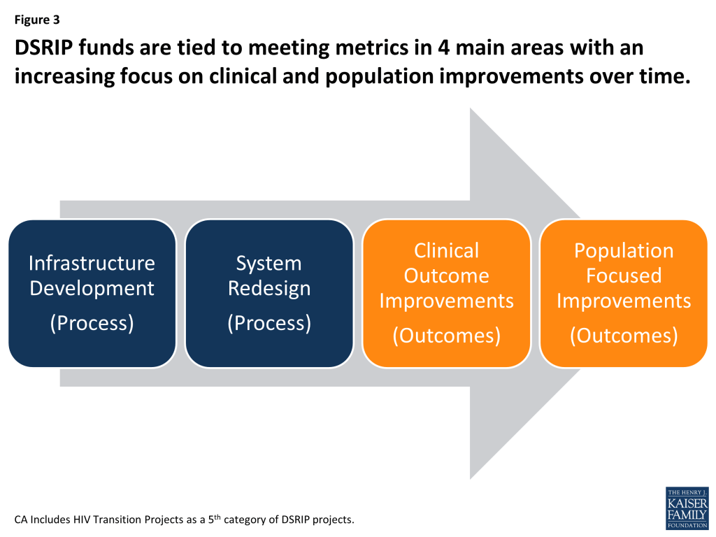 Under DSRIP initiatives, funds to providers are tied to meeting performance metrics. To obtain DSRIP funds, eligible entities (hospitals, and other providers, including provider coalitions) must meet certain milestones or metrics. While the exact structure and requirements of each DSRIP initiative differ, there is a focus on meeting process type metrics in the early years of the waiver, such as system redesign or infrastructure development, and then meeting more outcome based metrics in later years, such as clinical health or population based improvements. In support of these milestones and metrics, the DSRIP waivers impose robust data collection and reporting requirements on providers. Most recently, in the approval of the New York DSRIP plan, state DSRIP funds are also tied to meeting performance metrics beginning in year 3 of the waiver.