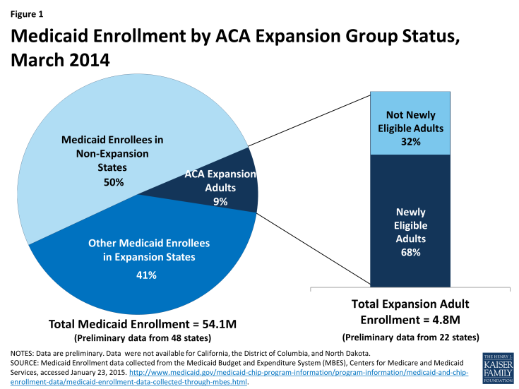 The preliminary MBES enrollment data released to date provide total Medicaid enrollment and enrollment in the ACA Medicaid expansion category for January through March 2014 for 48 states. The enrollment counts include the number of individuals enrolled at any time during the reporting month. Analysis of the March 2014 preliminary enrollment data shows the following: