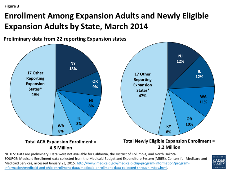 Enrollment of adults in the expansion group is concentrated in a small number of states. Half of the total 4.8 million adults enrolled in the expansion group during March 2014 resided in five states (New York, Oregon, New Jersey, Illinois and Washington State.) (Figure 3) However this distribution varied for the 3.2 million expansion adults who qualify for the 100% federal match for newly eligible adults. Over half resided in New Jersey, Illinois, Washington State, Oregon and Kentucky (Figure 3). If data from California were available, these shares would likely change.