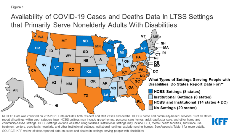 As of February 11, 2021, 31 states report at least some data on COVID-19 cases and deaths in LTSS settings that primarily serve nonelderly people with disabilities (Figure 1 and Appendix Table 1). These settings include both home and community-based settings such as group homes, personal care homes, adult day programs, and other community-based settings; and institutional settings such as intermediate care facilities and psychiatric institutions. Not all states report all types of settings within each category. These data exclude settings that primarily serve elderly adults, such as nursing facilities and assisted living facilities (ALFs), to best reflect cases and deaths solely among nonelderly adults with disabilities. For state-level data broken out by resident/staff cases/deaths, details on the types of facilities included in each state’s count, dates of data, links to the state reports, and additional notes, see Appendix Table 1.
