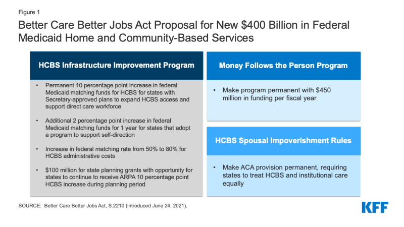 The Better Care Better Jobs Act, recently introduced by Democratic lawmakers, outlines three provisions to expand and strengthen Medicaid HCBS and the direct care workforce, as proposed in President Biden’s American Jobs Plan (Figure 1). The major provision, which would account for most of the funding, is a new “HCBS Infrastructure Improvement Program,” which offers permanent enhanced federal Medicaid matching funds for HCBS if states choose to participate and meet certain requirements. The other provisions would make both Money Follows the Person and the requirement for states to apply spousal impoverishment protections to HCBS permanent.