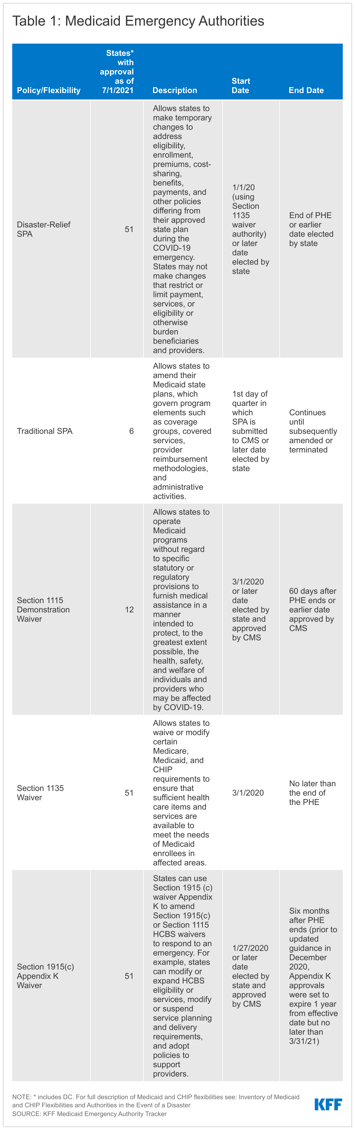 The unprecedented nature of the COVID-19 pandemic resulted in wide adoption by states of available Medicaid emergency authorities to expand Medicaid capacity and target services, providers, and enrollees that were impacted by the coronavirus emergency. Based on our tracking between March 2020 and July 2021, all 50 states and DC received approval to make changes through Disaster-Relief state plan amendments (SPAs), Section 1135 waivers and Section 1915(c) Appendix K waivers. Additionally, twelve states received approval for changes through a Section 1115 waiver and six states made changes through regular SPAs. States adopted many policies through these existing authorities similar to previous disasters, including to connect individuals to coverage more quickly and to address needs of affected populations.