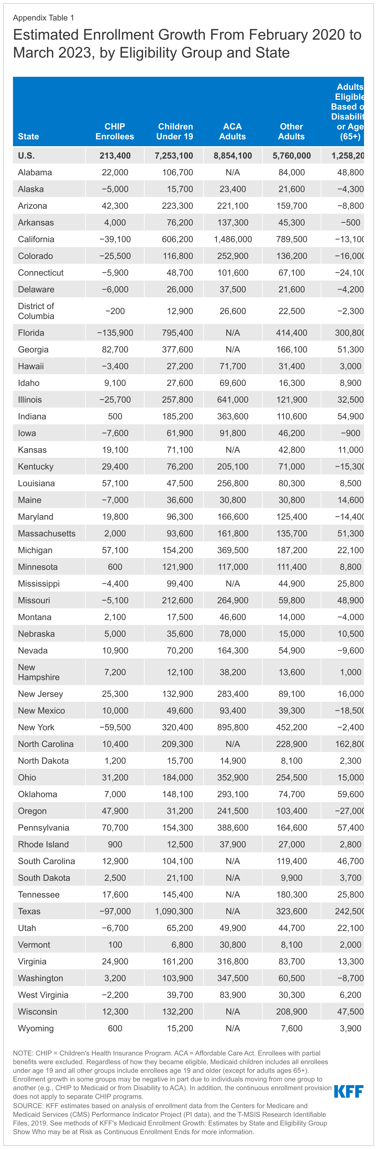 This analysis estimates Medicaid enrollment growth by state and eligibility group between February 2020, before the pandemic, and March 31, 2023, at the end of the continuous eligibility period. These estimates can help paint a picture of the overall number and composition of enrollees who may risk coverage loss after the continuous enrollment provision ends. Prior to the continuous enrollment period, typical patterns of enrollment included disenrollments throughout the year. Some enrollees disenroll and then re-enroll within a short period of time (or “churn” in and out of Medicaid). The continuous enrollment provision halted disenrollment and churn, resulting in overall program growth. While states will need to conduct renewals for all enrollees, understanding the overall growth in enrollment and the composition of that growth can help inform understanding the range of potential outcomes as the continuous enrollment unwinds. How individual states implement the unwinding will affect the ultimate loss of coverage.