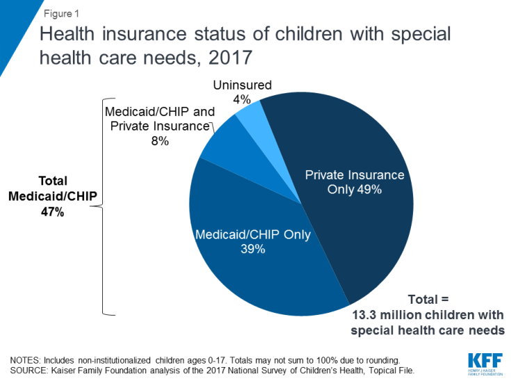 Medicaid and CHIP covered about half (47%) of the 13.3 million children with special health care needs in 2017. These children require medical and long-term care services due to intellectual/developmental disabilities, physical disabilities, and/or mental health disabilities. This issue brief describes the role that Medicaid plays for children with special health care needs and includes 50-state data on those covered by Medicaid/CHIP. Key findings include the following:
