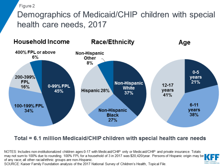 Most Medicaid/CHIP children with special health care needs are school-aged (Figure 2). Just over one in five (21%) Medicaid/CHIP children with special health care needs are age 5 or younger, with the remainder about evenly split between the 6 to 11 (38%) and 12 to 17 (41%) age groups.