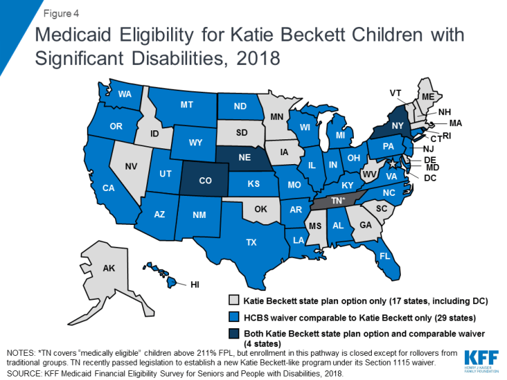 Nearly all states choose to expand Medicaid financial eligibility for children with special health care needs at higher incomes through optional disability-related pathways (Figures 3 and 4). As of 2018, all states but one opt to cover at least some children with significant disabilities living at home under the “Katie Beckett” state plan option or a comparable waiver. This pathway disregards parental income and assets, just as they are for children with disabilities living in an institution, which makes it possible for children with disabilities to receive necessary care while remaining at home with their families. The child’s own income, up to 222% FPL (or three times the SSI limit, $27,727/year for an individual in 2019), and assets (generally limited to $2,000) are counted. Katie Beckett children also must meet SSI medical disability criteria and otherwise qualify for an institutional level of care according to functional eligibility criteria set by the state.