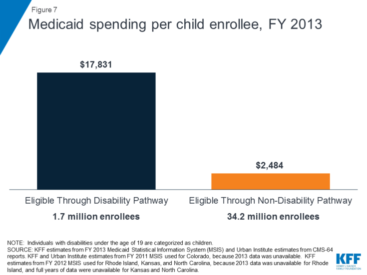 Annual per enrollee spending is over seven times higher for Medicaid children who are eligible through a disability pathway ($17,831) compared to those who are eligible through a non-disability pathway ($2,484) as of 2013 (Figure 7). This reflects the greater intensity and variety of needs among most children who qualify for Medicaid based on a disability, compared to most children who qualify through another pathway, such as family income. As described above, the Medicaid definition of “disability” is generally more restrictive that the definition of “special health care needs.” As of 2013, 1.7 million Medicaid children qualified through a disability pathway, while 34.2 million children qualified through a non-disability pathway (Figure 7).