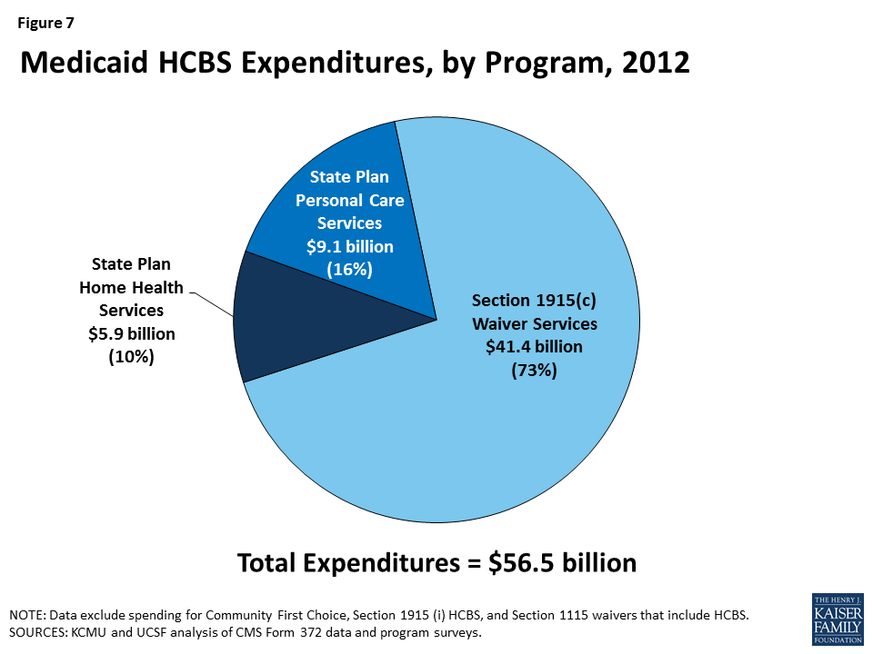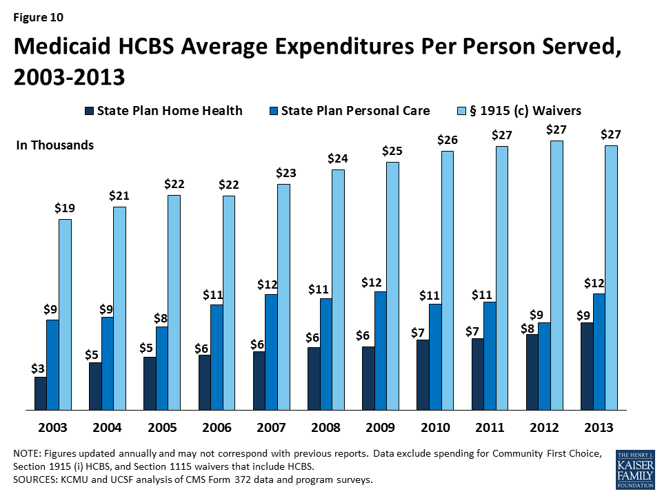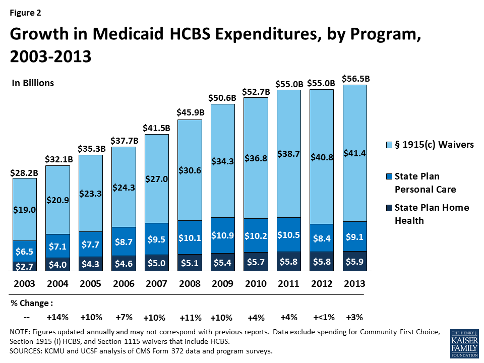 - In 2013, Medicaid HCBS expenditures for home health state plan services, personal care state plan services, and § 1915 (c) waivers totaled $56.5 billion, increasing slightly from 2012, and lower than the 10-year average of seven percent (Figure 2). In 2013, spending growth in HCBS programs was led by personal care state plan services (9%) followed by home health state plan services (2%), while § 1915 (c) waivers increased by only one percent.