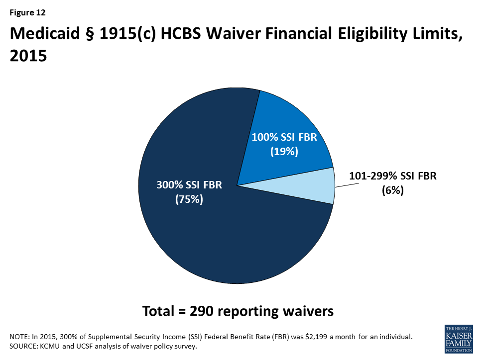 Most states set their Medicaid financial eligibility standard for nursing facility services at 300 percent of the Supplemental Security Income (SSI) federal benefit rate ($2,199/month for an individual in 2015). States may set financial eligibility standards for Medicaid § 1915 (c) waivers at the same level as that for nursing facilities. There is, however, wide variation in financial eligibility standards across states and HCBS waiver programs as shown in Table 11. Twenty-five percent of reporting waiver programs used more restrictive financial eligibility standards (e.g., 100% of SSI) than used for nursing facilities (300% of SSI) in 2015 (Table 11 and Figure 12).