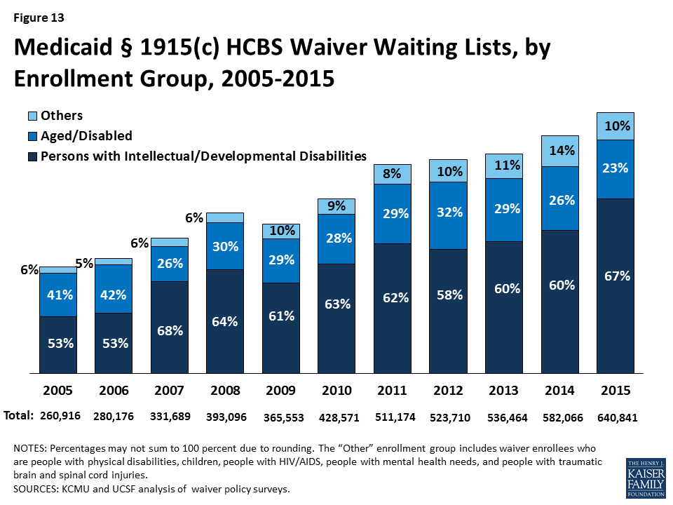 - The aged/disabled population made up the largest share of waiver enrollment (48%) but accounted for 21 percent of spending on waiver services in 2013 (Figure 3). People with I/DD accounted for 41 percent of HCBS waiver enrollment in 2013, but 71 percent of spending on waiver services was devoted to this population, again reflecting their more intensive need for LTSS relative to other groups.