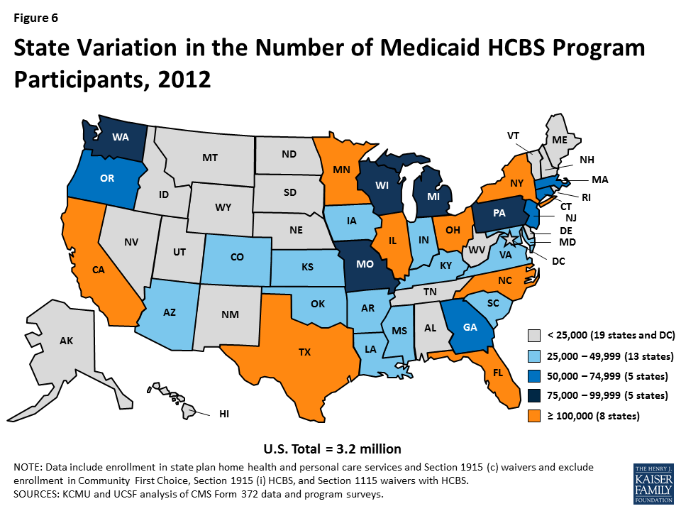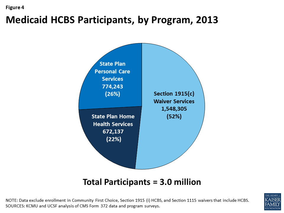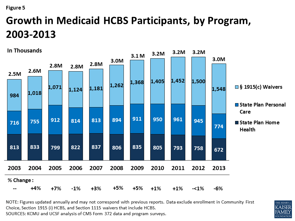 - In 2013, almost 3 million people accessed LTSS through one of the three main Medicaid HCBS programs (Figure 1). Within this population, the number of people receiving § 1915 (c) waiver services increased slightly from 2012 to 2013 (by 3%), while the number of people receiving personal care state plan services and home health state plan services decreased (by 18% and 11%, respectively). A total of 672,137 people received home health state plan services (in 50 states and DC), 774,243 received personal care state plan services (in 32 states), and almost 1.55 million were served through § 1915 (c) waivers (in 47 states and DC). The number of individual § 1915 (c) waivers declined slightly from 290 to 289 nationwide in 2013. States also may offer HCBS through the newer ACA options or § 1115 managed care programs instead of or in addition to these three authorities.