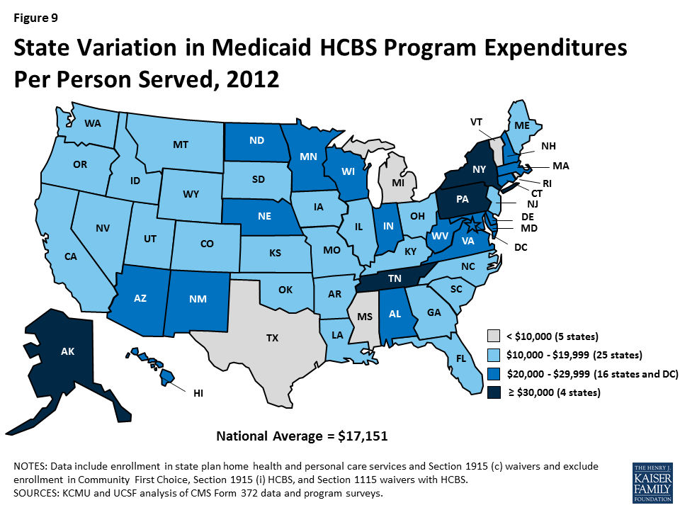 - Per participant annual spending on Medicaid HCBS averaged $18,870 in 2013, but there was considerable variation among states and programs. Across states, Medicaid HCBS expenditures per participant served ranged from $9,641 in Michigan to $49,212 in Delaware. Per participant spending also varied across the three main HCBS programs, ranging from a national average of $8,827 for home health state plan participants to $26,768 for § 1915 (c) waiver participants. These program-to-program differences were due to the types and extent of services offered in the different home and community-based programs. Per participant spending also varied among § 1915 (c) waivers targeted to different beneficiary populations. For example, per participant spending in § 1915 (c) waivers targeted to beneficiaries with intellectual/developmental disabilities (I/DD) was considerably higher than for other beneficiary groups, reflecting the I/DD population’s relatively more intensive need for LTSS.