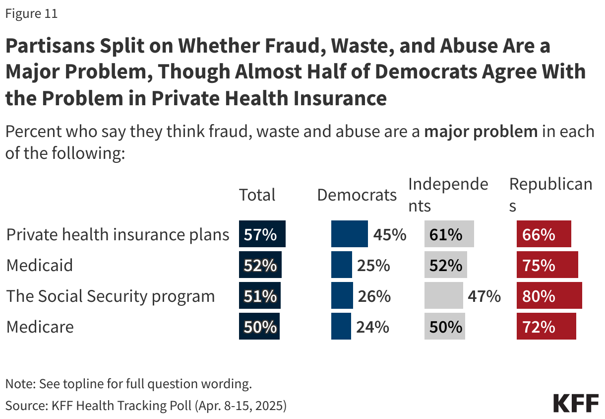 - Most of the public agree with the Trump administration that fraud, waste, and abuse are a problem in health care in the U.S., yet partisans disagree on whether the cuts will make any difference and on who is responsible for it. Roughly four in ten (43%) of the public say cuts to staff and spending at government health agencies will negatively impact reducing fraud, waste, and abuse in health care, which is similar to the share (38%) who say there will be a positive impact. Additionally, while majorities (57%) think fraud, waste and abuse are a “major problem” in private health insurance plans, fewer – about half – think fraud is a problem in Medicaid (52%), Social Security (51%), and Medicare (50%). Half of Democrats identify private health insurance companies as the group most responsible for fraud, waste, and abuse in government health programs while four in ten Republicans place the blame on government employees running the programs.