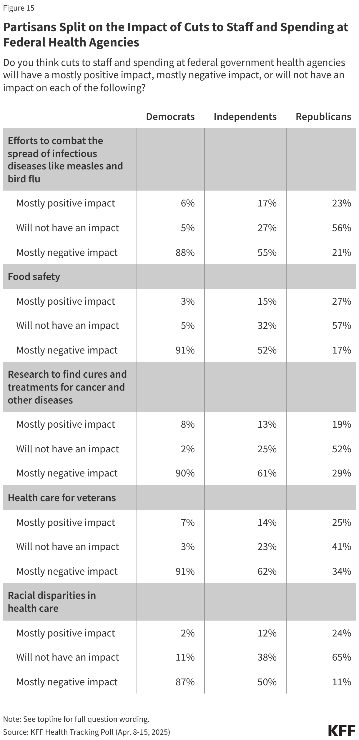 Most Democrats say the cuts to staff and spending will negatively impact health care for veterans (91%), food safety (91%), research to find cures and treatments for cancer and other diseases (90%), efforts to combat the spread of infectious diseases like measles and bird flu (88%), and racial disparities in health care (87%).