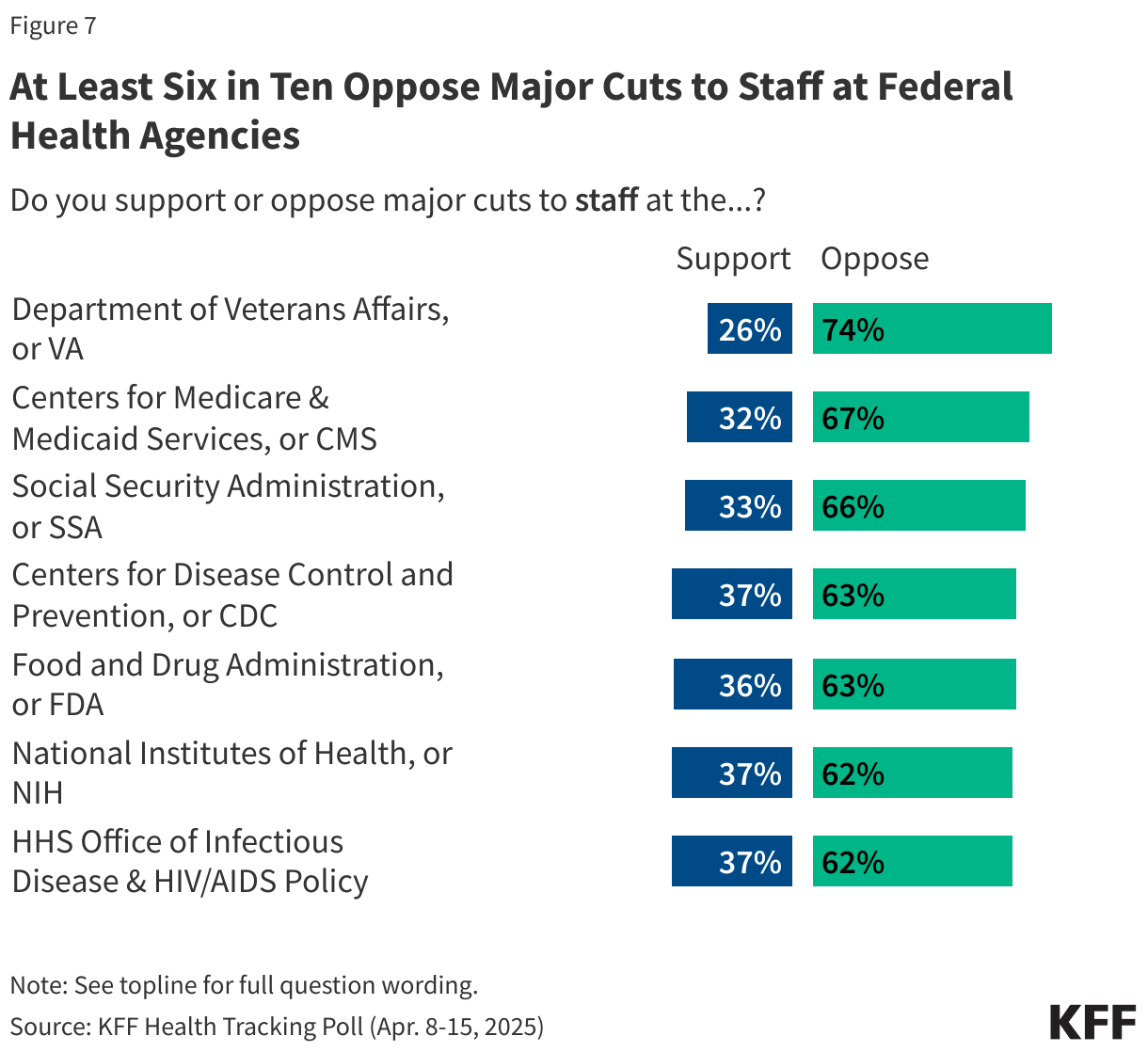 At least six in ten of the public also oppose cuts to staff at the Centers for Medicare and Medicaid Services, or CMS (67%), the Social Security Administration, or SSA (66%), the Food and Drug Administration, or FDA (63%), the Centers for Disease Control and Prevention, or CDC (63%), HHS Office of Infectious Disease & HIV/AIDS Policy (62%), and the National Institute of Health, or NIH (62%).