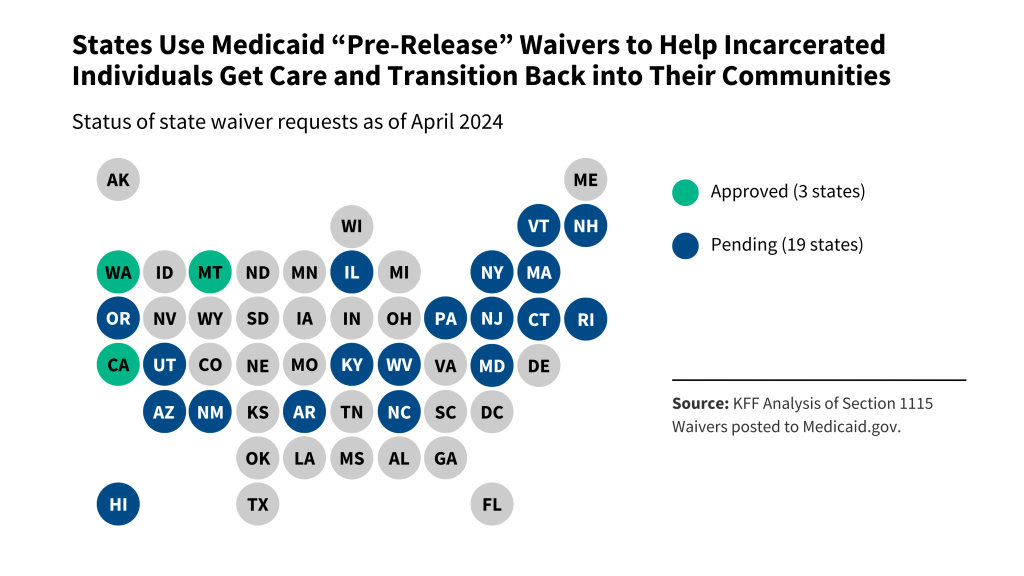 - Three states (California, Montana, and Washington) have approval to provide pre-release services to certain incarcerated, Medicaid-eligible individuals as of April of this year. California estimates that approximately 200,000 people each year will be eligible to receive pre-release services, and Washington estimates 4,000 people per year will receive them. Nineteen additional states have waiver requests pending with CMS.