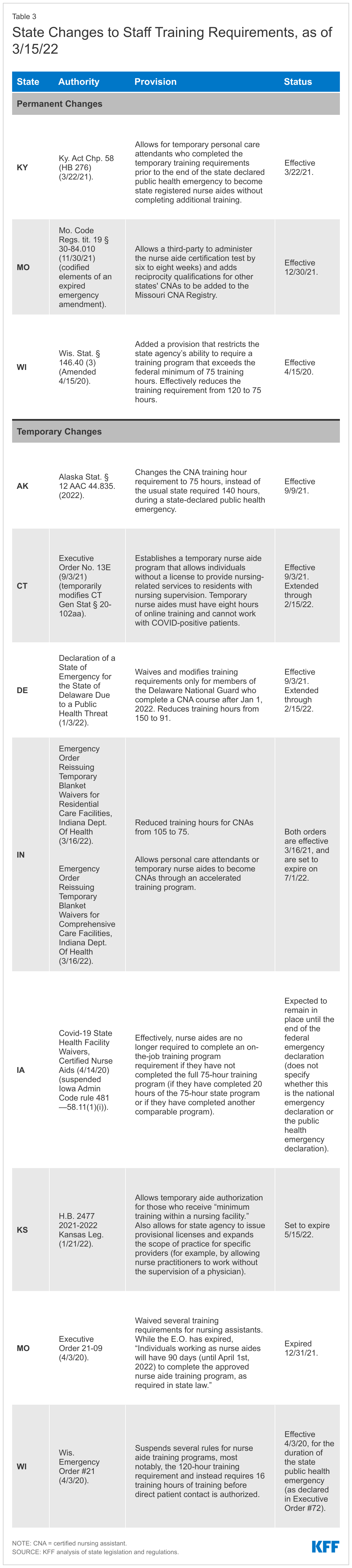 Training: At least 3 states (KY, MO, WI) adopted permanent changes to staff training requirements post-COVID to expand the pool of staff available to work in nursing homes, while at least 8 states (AK, CT, DE, IA, IN, KS, MO, WI) adopted temporary changes in this area.