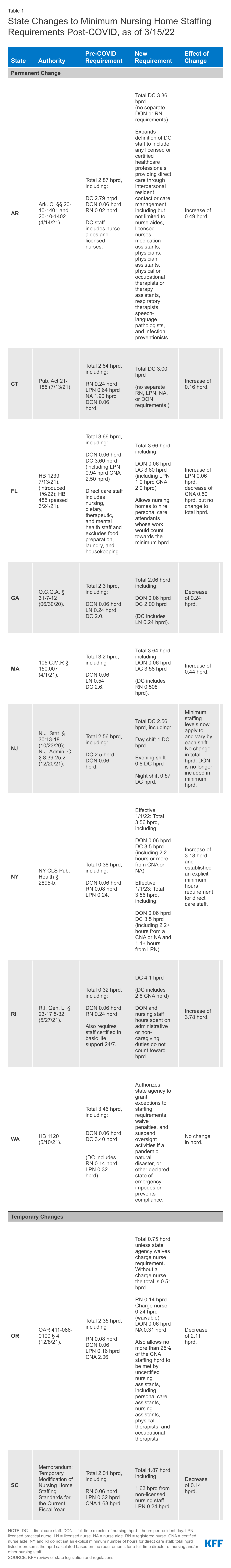 Staffing Requirements: At least five states (AR, CT, MA, NY, RI) adopted permanent increases to nursing home minimum staffing requirements after the onset of the COVID-19 pandemic, while at least one state (GA) adopted a permanent decrease. At least two states (OR, SC) adopted temporary decreases to account for potential staffing issues during the pandemic.