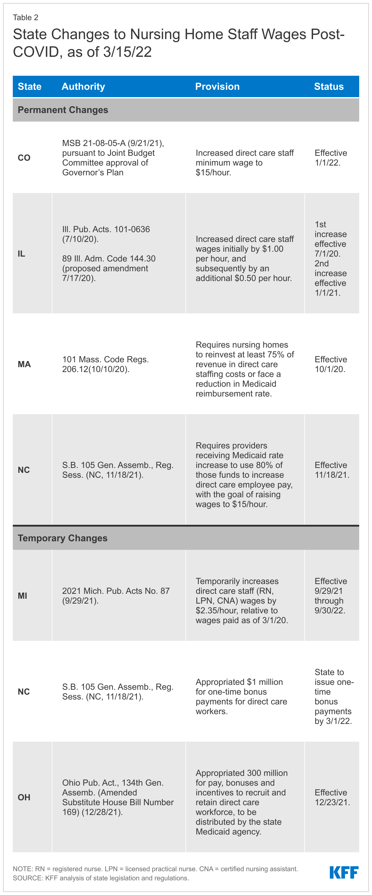 Wages: At least four states (CO, IL, MA, NC) adopted laws or regulations that require increases to nursing home staff wages since the onset of the COVID-19 pandemic. At least three states (MI, NC, OH) adopted temporary increases or one-time bonuses to nursing home staff wages post-COVID. Other states may have adopted or proposed Medicaid provider reimbursement rate changes that do not explicitly require corresponding increases in direct care staff wages.