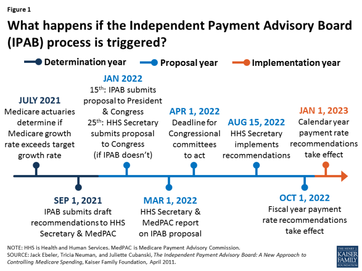A determination by the Chief Actuary that Medicare spending reductions are required under the IPAB process initiates a three-year cycle, which includes a determination year (2021 in this case), proposal year (2022) and implementation year (2023) (Figure 1).