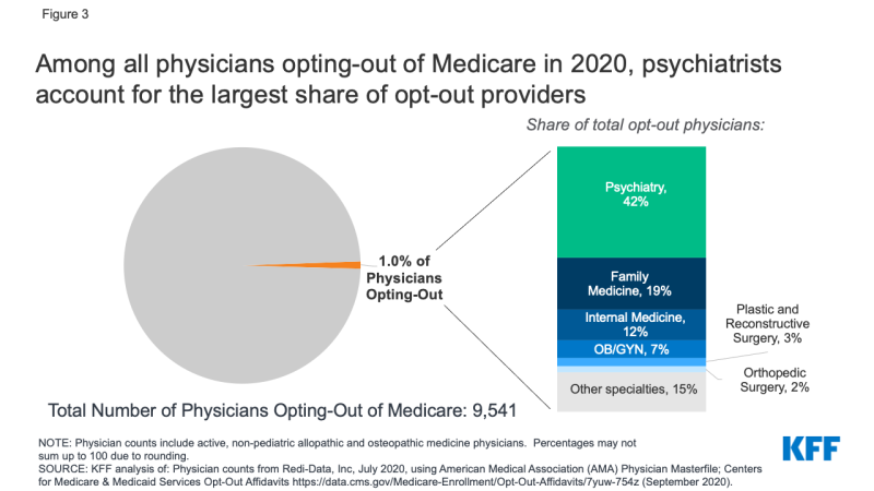 - About one percent of all non-pediatric physicians have formally opted out of the Medicare program in 2024. The share was highest for psychiatrists (8.1%), followed by plastic and reconstructive surgeons (4.5%) and neurologists (3.2%).