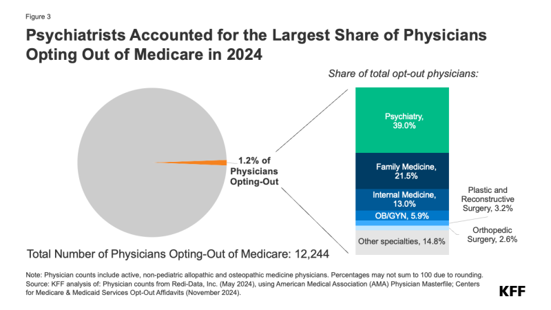 - Psychiatrists account for the largest share (39.0%) of all non-pediatric physicians who have opted out of Medicare in 2024, followed by family medicine physicians (21.5%) and internal medicine physicians (13.0%).