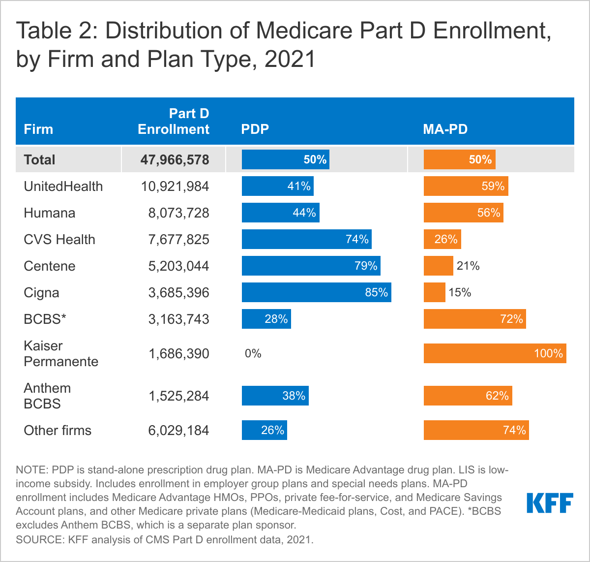 The top three firms – UnitedHealth, Humana, and CVS Health – cover close to 6 in 10 of all beneficiaries enrolled in Part D in 2021 (56%), while the top five firms – including Centene and Cigna – account for three-quarters (74%) of Part D enrollment (Figure 2). With the exception of Kaiser Permanente, which exclusively offers MA plans, the top Part D plan sponsors offer both stand-alone PDPs and MA-PDs. For most firms, Part D enrollment is more concentrated in one market than the other; for example, CVS Health, Centene, and Cigna have greater enrollment in PDPs than MA-PDs (Table 2).