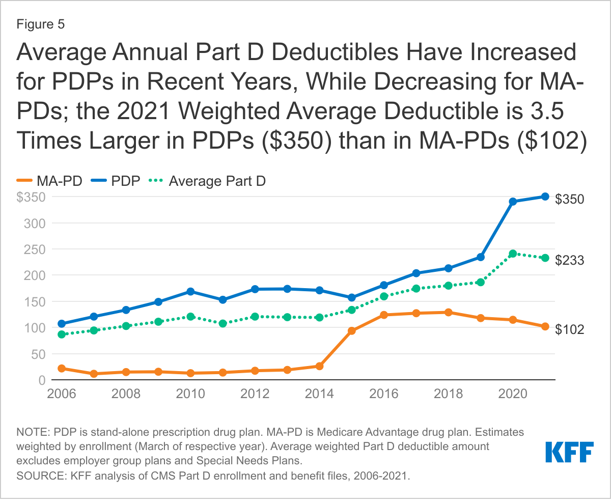 The average Part D deductible has increased for PDPs, while decreasing for MA-PDs; the 2021 weighted average annual drug deductible is 3.5 times larger in PDPs than in MA-PDs