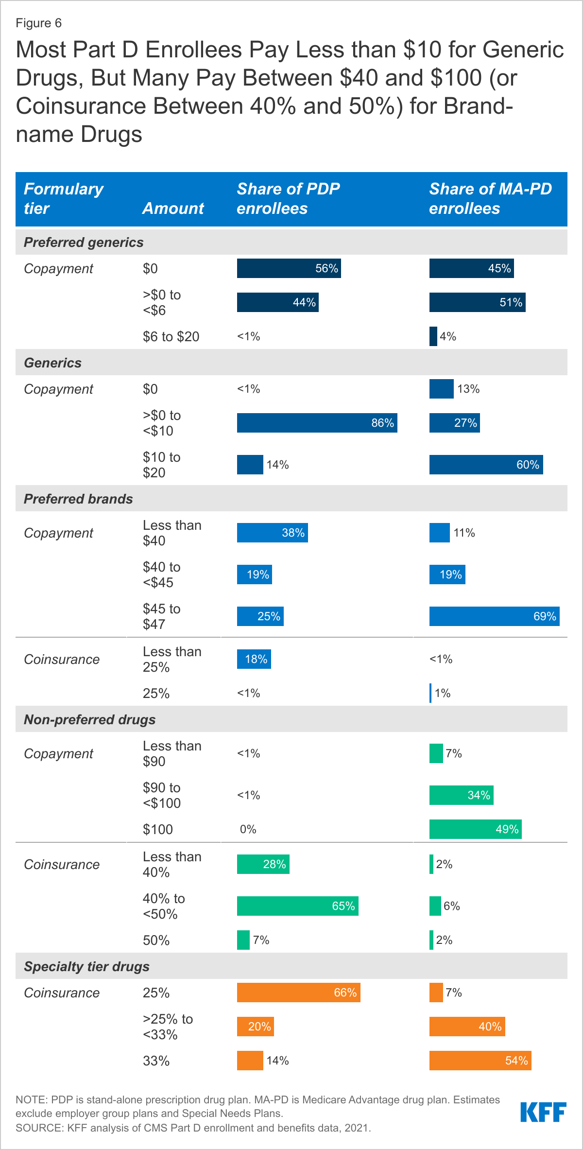 Most Part D enrollees pay less than $10 for generic drugs, but many pay $40-$100 (or coinsurance of 40%-50%) for brand-name drugs; a larger share of MA-PD enrollees than PDP enrollees pay the maximum 33% coinsurance for specialty tier drugs