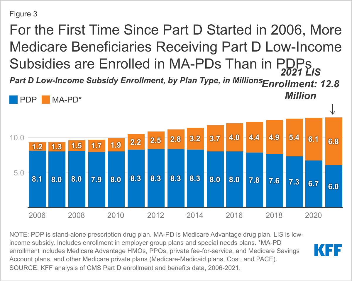In 2021, nearly 13 million Part D enrollees, or just over 1 in 4, receive premium and cost-sharing assistance through the Part D Low-Income Subsidy (LIS) program. These additional financial subsidies, also called “Extra Help,” pay Part D premiums for eligible beneficiaries, as long as they enroll in stand-alone PDPs designated as premium-free “benchmark” plans, and reduce cost sharing. For the first time since Part D started in 2006, more LIS enrollees are in MA-PDs (6.8 million) than in PDPs (6.0 million) (Figure 3). Reflecting overall trends in Part D enrollment, the share of LIS enrollees in stand-alone PDPs has declined over time, from 87% in 2006 to 47% in 2021, while the share in MA-PDs has increased, from 13% in 2006 to 53% in 2021 (Table 1).
