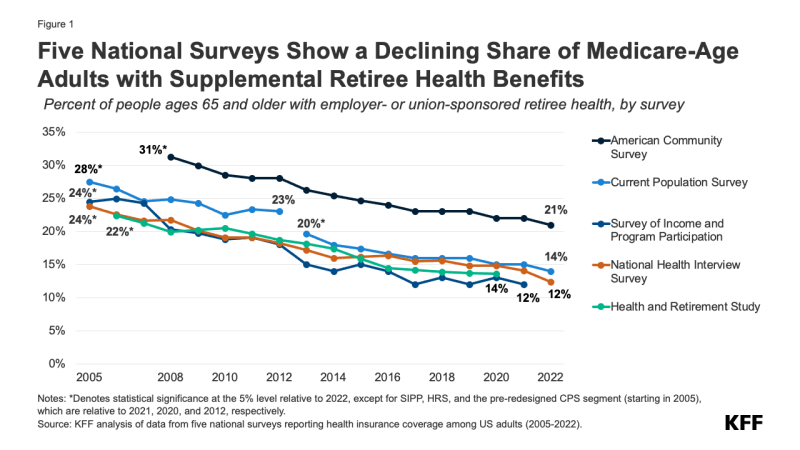 This data note analyzes five national surveys to assess trends in retiree health coverage among people ages 65 and older (Figure 1). These five surveys produce somewhat different estimates of retiree health coverage, but together paint a clear picture: the share of Medicare-age adults with employer- or union-sponsored retiree health coverage has been shrinking and appears to be on the way to extinction.