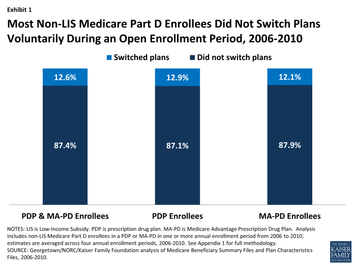 - Seven out of ten Medicare beneficiaries enrolled in stand-alone PDPs during all four annual open enrollment periods from 2006 to 2010 did not voluntarily switch plans in any of the four enrollment periods.