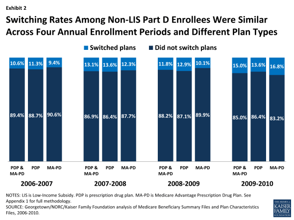 - The 13 percent switching rate exceeds the estimate reported in a CMS press release in January 2008 stating that 6 percent of all non-LIS beneficiaries enrolled in Part D who made a change between 2007 and 2008 (more recent estimates have not been released by CMS).u00a0 CMS press release, January 31, 2008.u00a0 It is unclear what methodology was used by CMS for their 6 percent estimate.u00a0 Our estimate is comparable to numbers reported recently by the MedPAC (Report to the Congress, March 2013; Shinobu Suzuki, u201cMedicare Part Du2019s Competitive Design: Do Part D Enrollees Switch Plans?u201d June 2013) and Andrew Stocking (Congressional Budget Office, u201cCompetition and Bids in Medicareu2019s Prescription Drug Program,u201d Academy Health, June 2013).u00a0 In the March 2013 report, MedPAC reported an overall Part D switching rate of 13.6 percent for 2009-10; separately by plan type, the reported switching rate for 2009-10 was 13 percent for PDPs and 15 percent for MA-PD plans. ↩︎